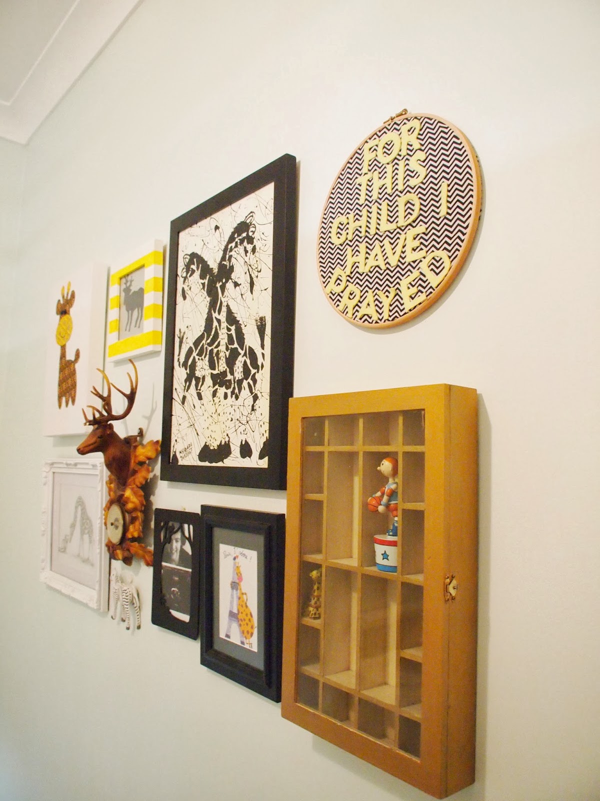 It's great to have a little gallery wall up and giving the room some charm and visual interest. The whole process of hanging the frames involved a lot of practising layouts on the carpet and a lot of measuring prior to any nailing of hooks. The only things to find now are a few more cute knicknacks for the shadowbox. So far it houses a little Eiffel tower giraffe and a basketball man so hopefully I can find a few more cute little things to fill the shelves (although I'll probably leave a few empty shelves for any special little gifts the bub might get or collect while growing up). I only have one more blank wall to add features too and then the walls will be finished. Then the process of buying/thrifting all the baby stuff will begin so the bub actually has the necessities. Here's hoping thrifting lots of these items will be easy!